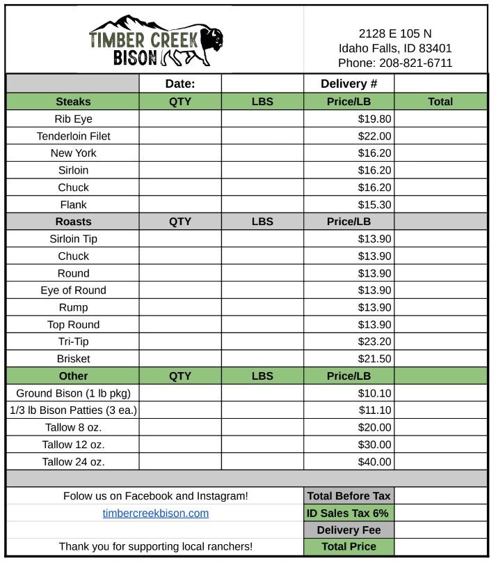 Timber Creek Bison is a member of the National Bison Association and frequently consults recent auctions and sales for updated market pricing so that we can provide the best pricing available to our customers.